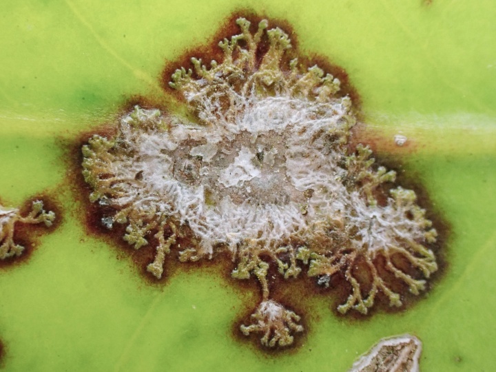 ・緑藻植物門スミレモ科ケファレウロス属 ・サカキに発生する。 ・主に葉表に生じる。葉上の藻体はほぼ円形、糸状体が房になって放射状に拡大する。罹病部周囲は紅褐色に変色する。 ・春~夏に、配偶子のう群が藻体表面に粒状に隆起する。また,遊走子のう柄が立ち上がり、先端に微細な粒状,橙色の遊走子のうが房状に形成される。 ・古くなると、中心部が脱落するか白色化し,周囲に新藻体が生じて輪状になる。 ・藻体は角皮下に侵入して,表皮と柵状組織の細胞が褐変して壊死する。