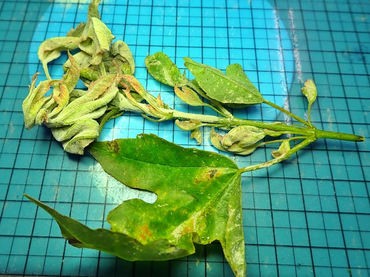 ・5月ごろに、新梢の葉の両面から広がる。葉表の被害のほうが葉裏より大きい。葉の奇形や白い白粉状の菌叢ができる。蔓延すると、激しく落葉するともに、落枝を伴う。
