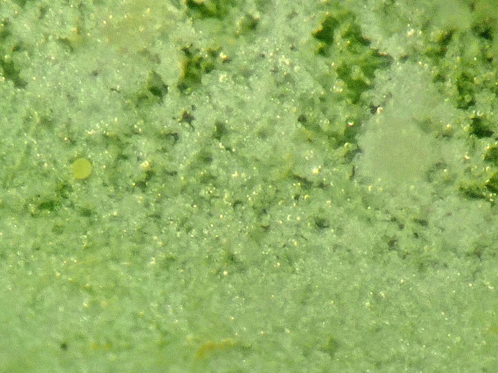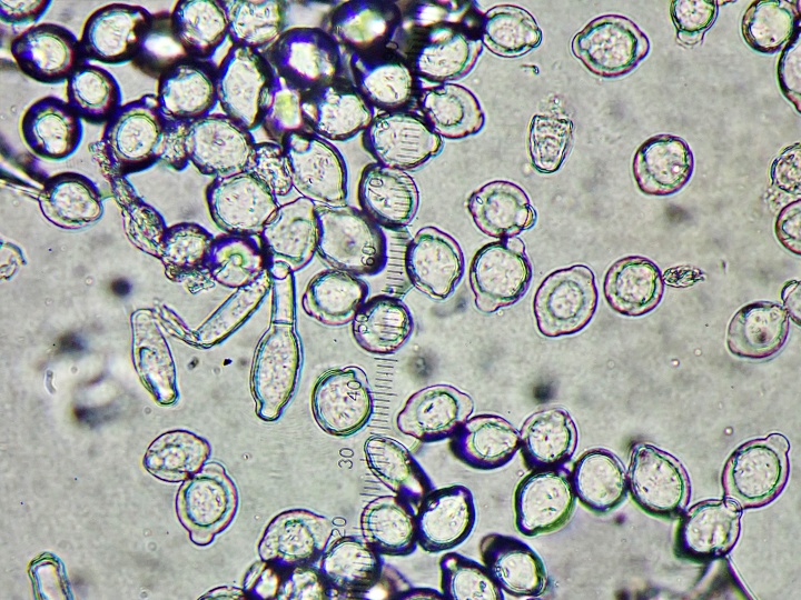 ・分生子は無色単胞、レモン形、フィブロシン体がある、25-35×15-20μm。分生子柄は表面菌糸から直立、隔壁がある。