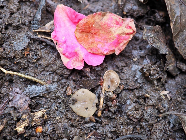 ・病原菌はツバキキンカクチャワンタケ(キンカクキン科ニセキンカクキン属) ・ツバキ、カンツバキに発生する。 ・花弁にのみ感染し、褐変して早期落花を起こす。 罹病落花内に菌核を形成して越年し、ツバキの開花時期に合わせて杯状、後にはほとんど平らなキノコ(子のう盤)を形成し、子のう胞子を飛散させて感染源とする。