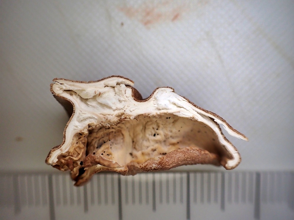表面は肉質または革質で、薄赤褐色~淡黄褐色。短い柄がある。
