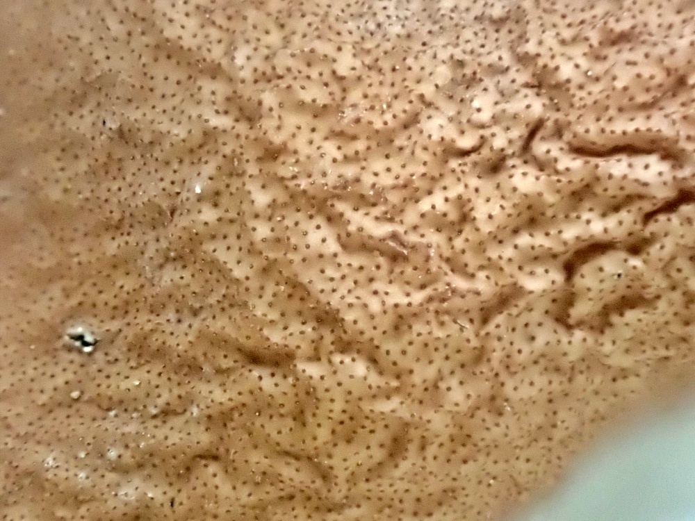 ・表面に埋没した子嚢殻が密に形成され、その孔口が小粒を散りばめたように見える。