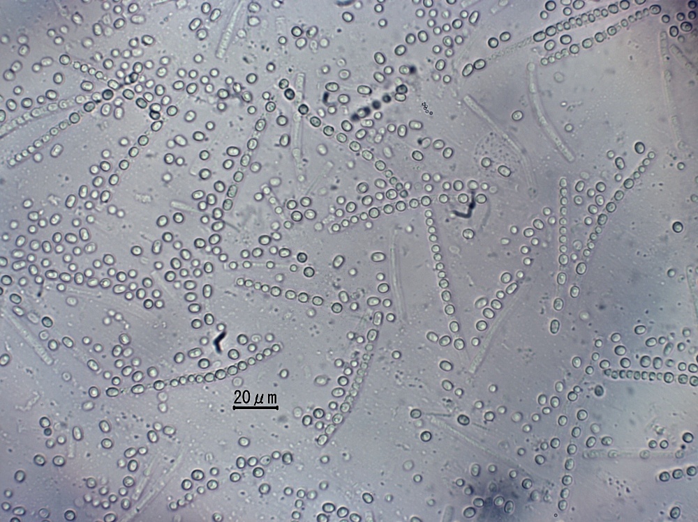 ・子嚢は細い円筒形、長さ75~130µm、幅4.0~8.0µm内外。