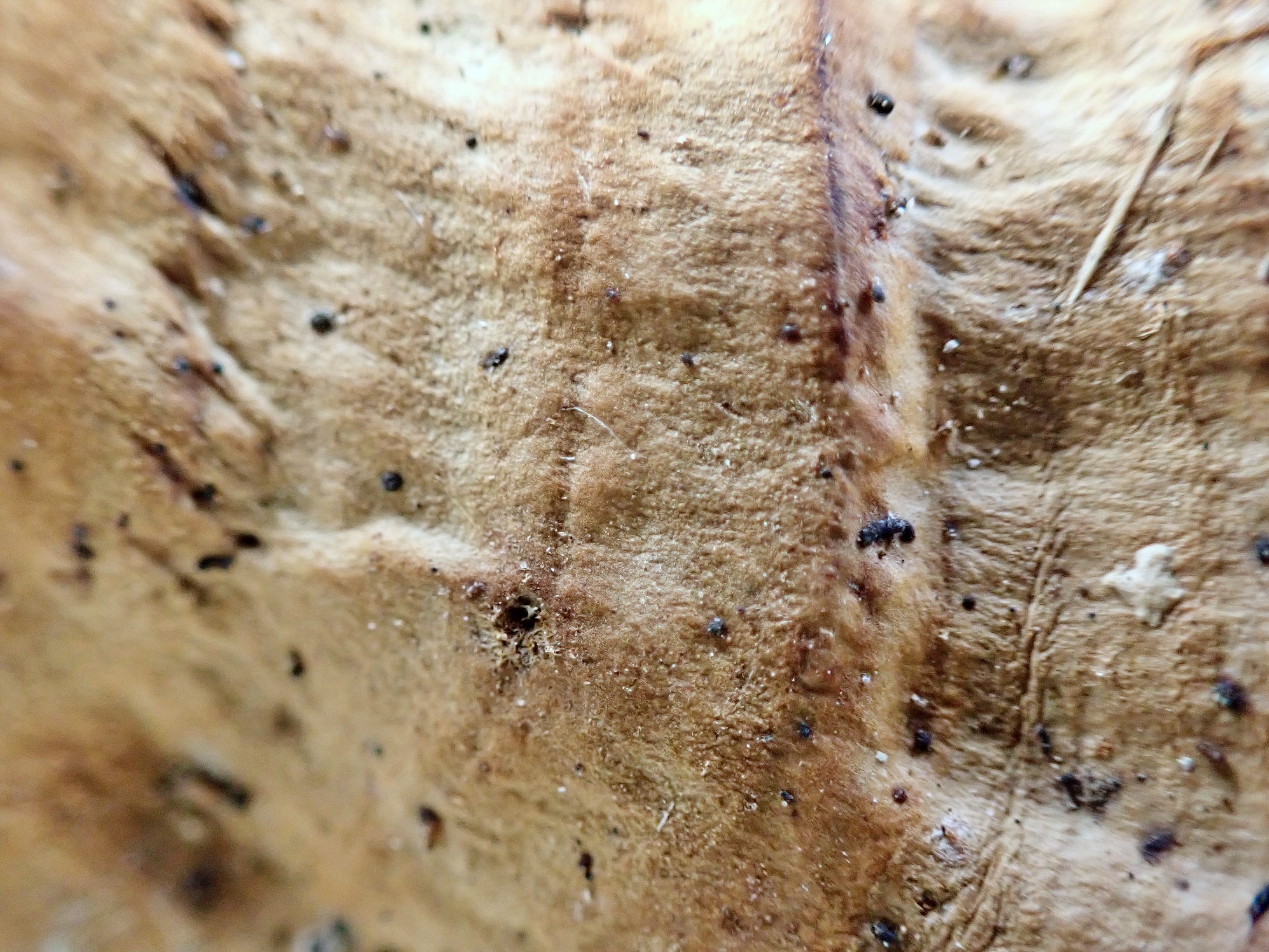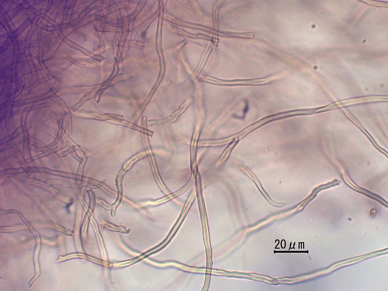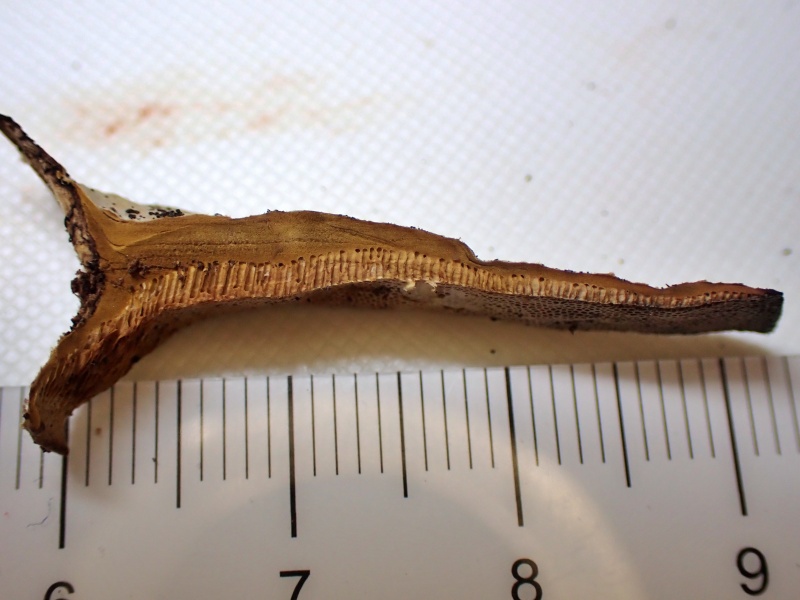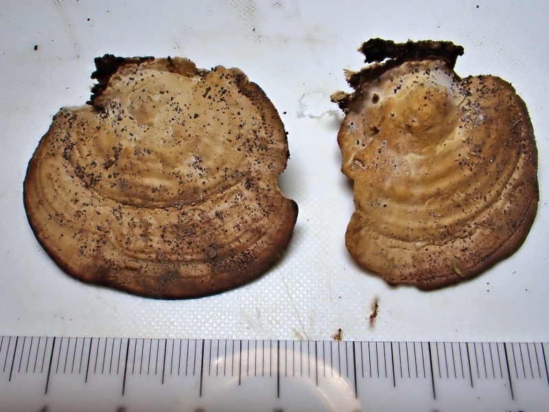 ・子実体は重生し、側着生。傘は幅10㎝以下、半円形~扇形、厚さ1㎝以下。傘の縁は薄い。傘表面は淡褐色~黄褐色~赤褐色、無毛~ややビロード状、環紋と環溝がある。柄は短い。 ・子実層托は新鮮時、淡紫褐色、強く触ると茶色になる。孔口は3~4個/㎜。傘肉は淡黄褐色。